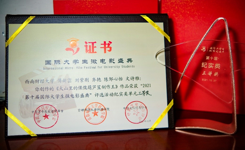 2021年12月6日,为了响应国家防疫的要求,备受影视传媒高校师生和行业关注的第十届国际老员工微电影盛典在京视网上首次以“线上”的形式开展,直播现场揭晓了第十届国际老员工微电影盛典全部获奖榜单,由公司研究生傅新雲、刘紫荆、齐艳、陈邹心怡、文诗雅等五位同学创作的纪录片《大山里的傈僳葫芦笙制作王》获纪实类三等奖,公司教师孙宁丰获评“最佳指导教师”。
