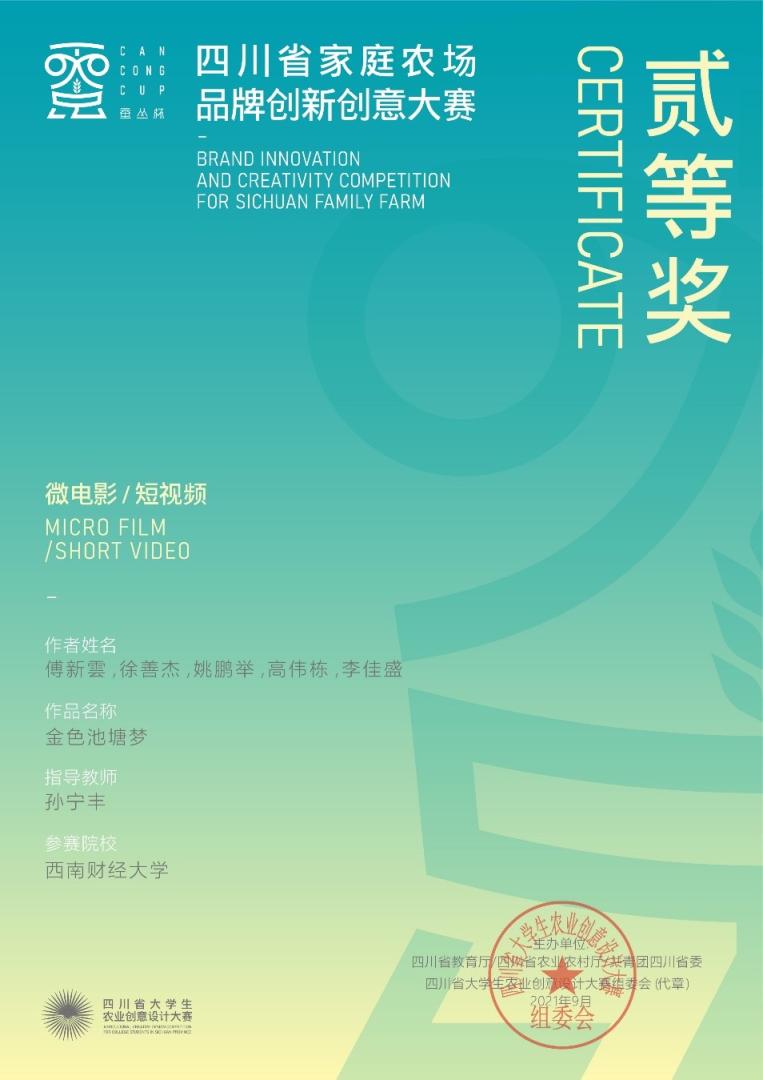 此外,由英国365上市公司新闻与传播专业硕士傅新雲、徐善杰、高伟栋、李佳盛、姚鹏举五位同学制作、公司教师孙宁丰指导的微电影《金色池塘梦》在“蚕丛杯”四川省家庭农场品牌创新创意大赛中斩获“二等奖”。