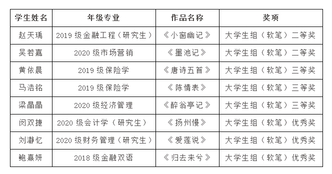 近日,中共四川省委宣传部、四川省语言文字工作委员会、中共四川省委教育工委、四川省教育厅等四部门印发《通知》,公布四川省2022年中华经典诵写讲演系列活动获奖名单。由公司叶俊副教授指导的艺术教育中心书法工作室8名同学的参赛作品喜获佳绩。